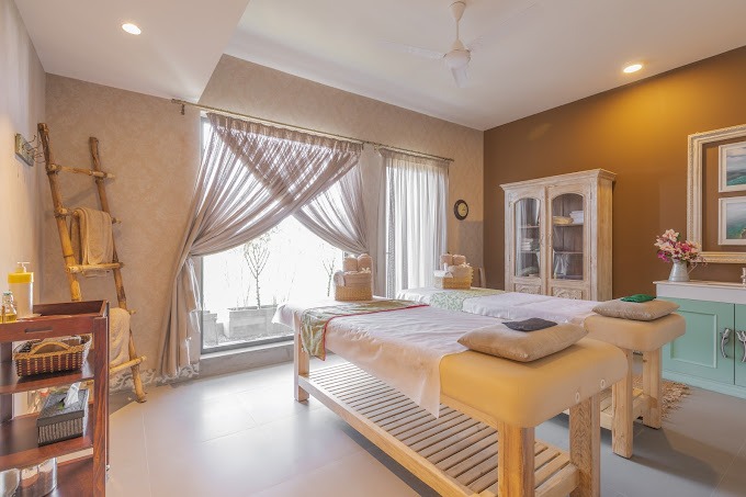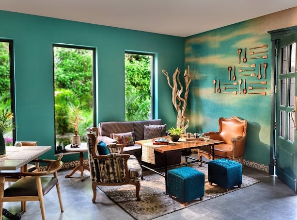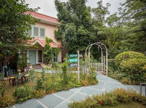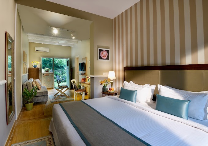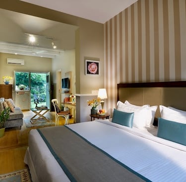 The resort emphasizes sustainable practices, including eco-friendly architecture and a dedication to preserving the environment, which adds to its tranquil ambiance. Amenities at Karma Chalets are top-notch, including an outdoor swimming pool, a fully-equipped fitness center, a spa, and access to an 18-hole golf course. For dining, the on-site restaurant Under the Neem serves a diverse range of cuisines, often with ingredients sourced locally or from their own organic farms, making every meal a fresh and flavorful experience.