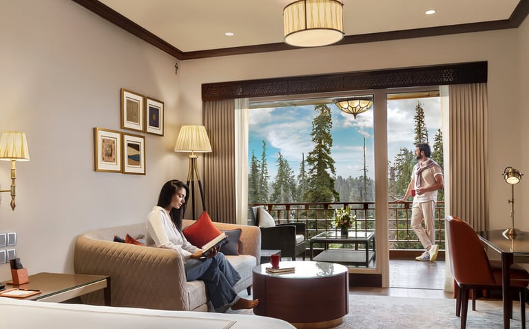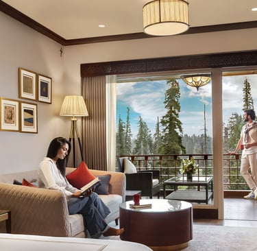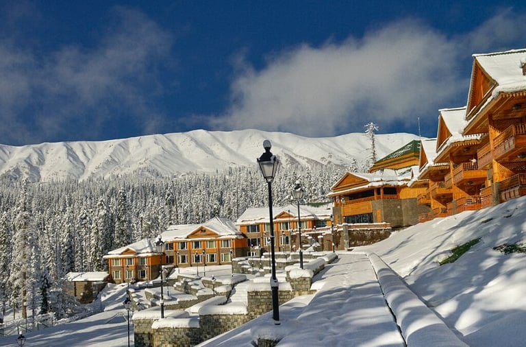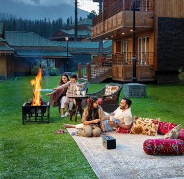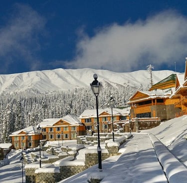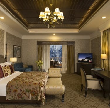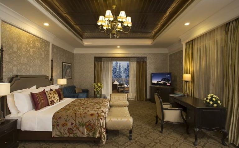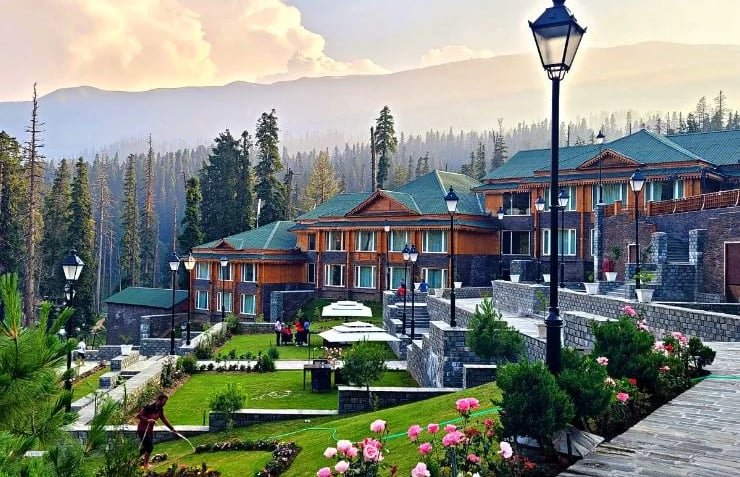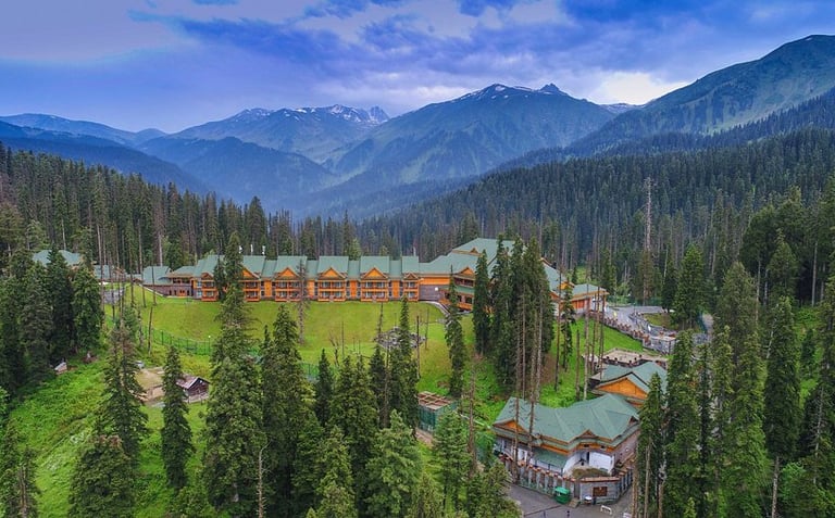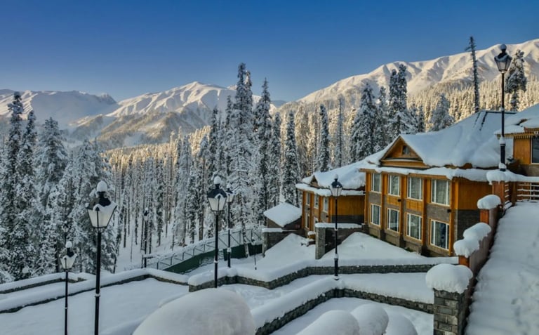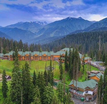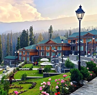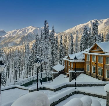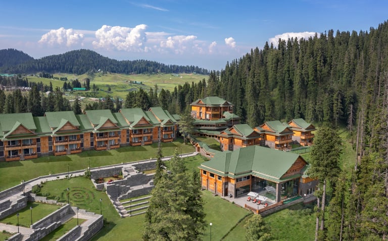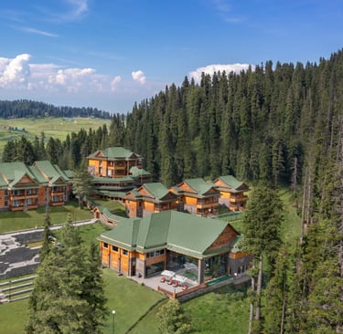 The Khyber Himalayan Resort & Spa in Gulmarg is a luxurious retreat nestled at 8,825 feet in the Pir Panjal range of the Himalayas. Spread over seven acres of pristine forest, the resort offers breathtaking views of the snow-capped Affarwat peaks. Its architecture reflects traditional Kashmiri craftsmanship, featuring interiors adorned with local timber, intricate woodwork, and rich textiles. The resort boasts 80 well-appointed rooms, four luxury cottages, and a Presidential Cottage, each offering panoramic vistas of the surrounding mountains and valleys. Guests can indulge in world-class amenities, including the renowned Khyber Spa by L’OCCITANE, a heated indoor swimming pool with stunning mountain views, and multiple dining options serving both local and international cuisines. Proximity to the Gulmarg Gondola makes it an ideal base for skiing and exploring the region's natural beauty.