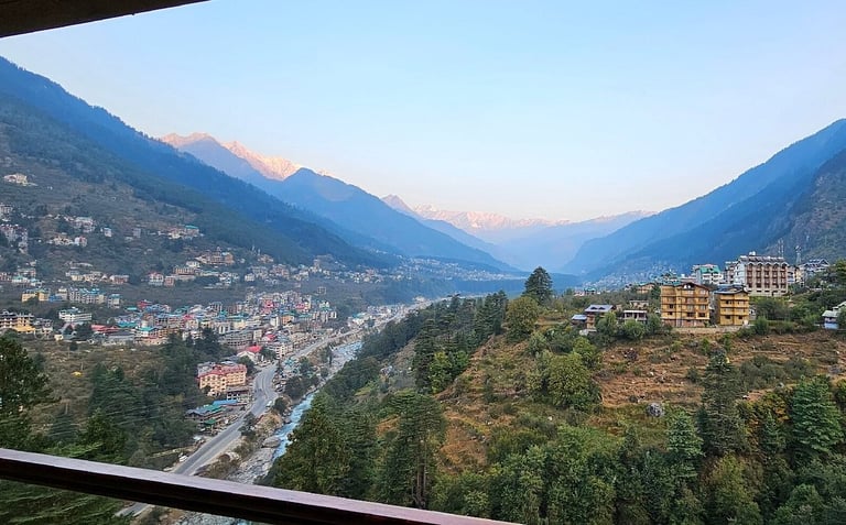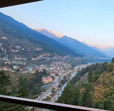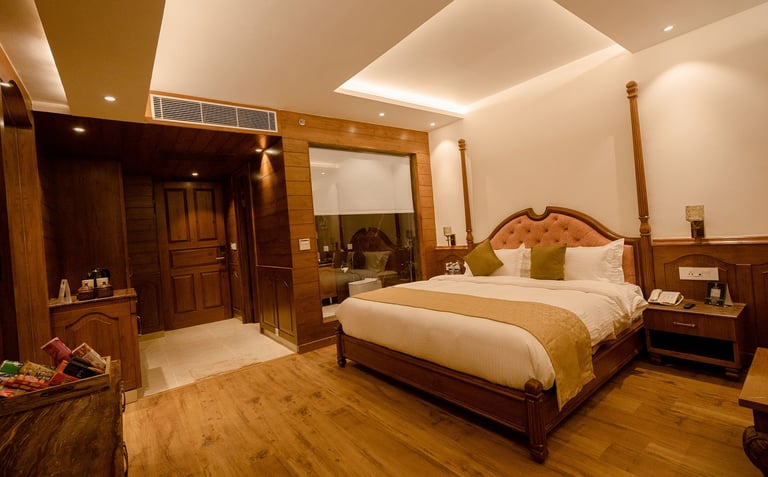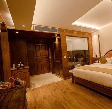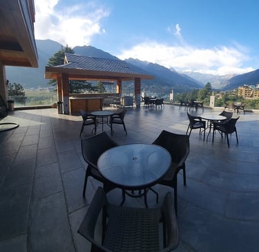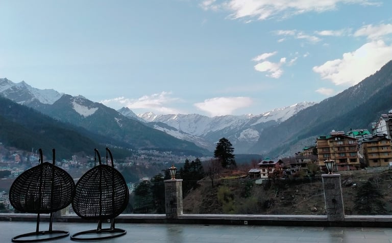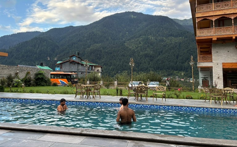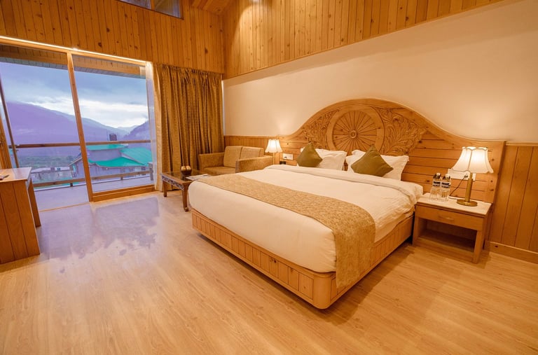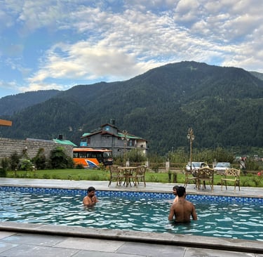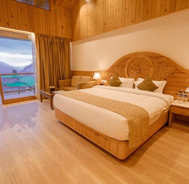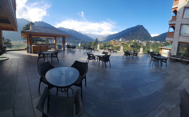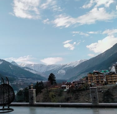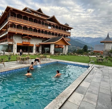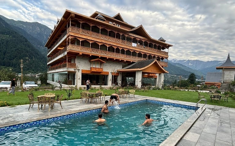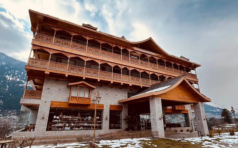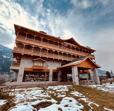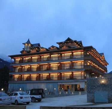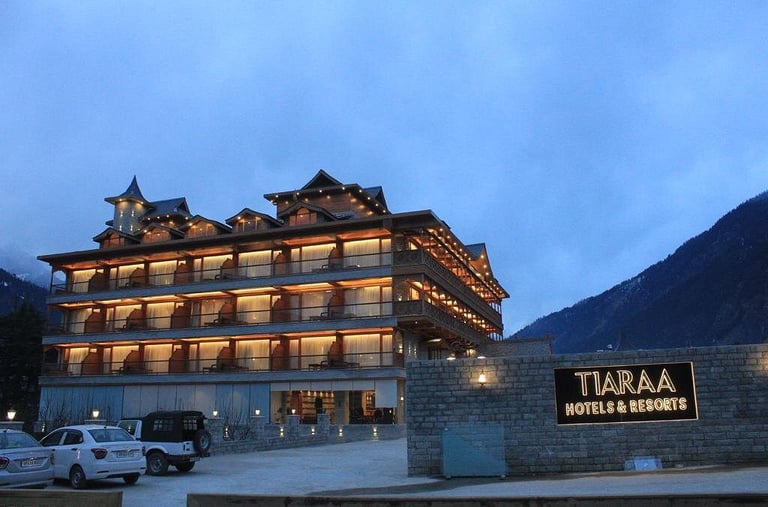 Tiaraa Hotels & Resorts in Manali is a luxurious 5-star retreat nestled along the Beas River, offering panoramic views of the Himalayas. The resort features elegantly designed rooms and suites with deodar wood furnishings and golden-themed interiors, complemented by modern amenities such as private balconies, jacuzzis, and climate control . Guests can indulge in facilities like a spa, fitness center, and gourmet dining, or partake in adventure activities like paragliding and trekking . With its serene apple orchards and proximity to Manali's attractions, Tiaraa provides a perfect blend of nature and luxury for a memorable stay.