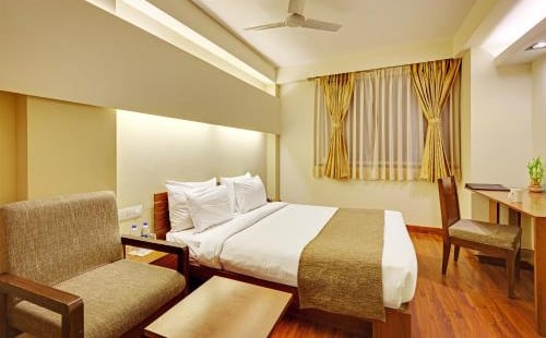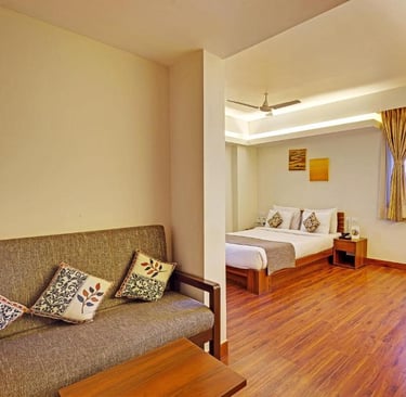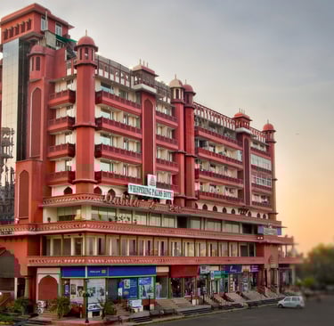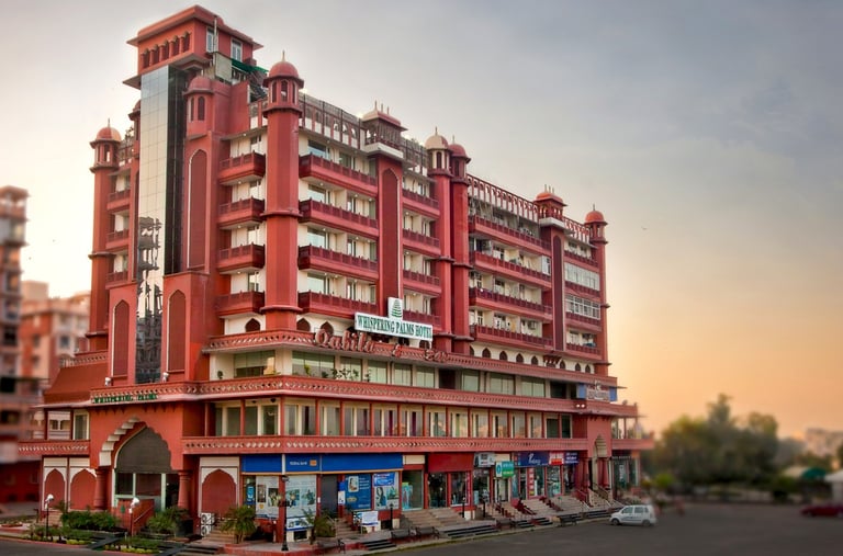 Whispering Palms Hotel, Jaipur is an upscale business hotel situated on Sikar Road, close to Vishwakarma Industrial Area. The hotel offers clean and comfortable rooms categorized into Deluxe, Executive, and Superior types, each featuring amenities like air conditioning, free Wi-Fi, and flat-screen TVs. Dining options include a multi-cuisine restaurant serving Indian, Mughlai, and local dishes. Additional facilities comprise conference halls, a gym, and express laundry services.