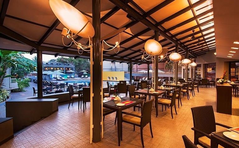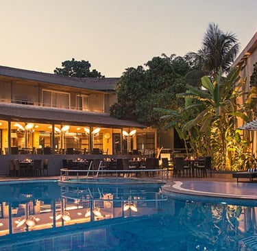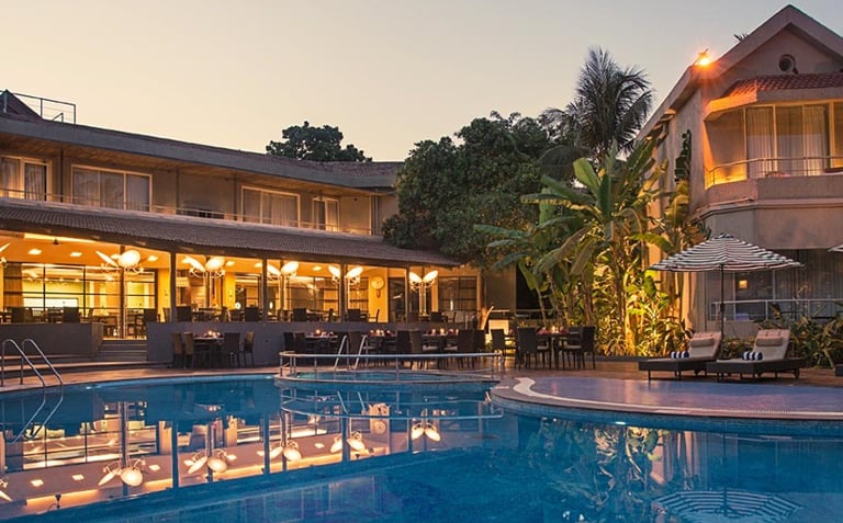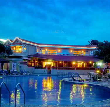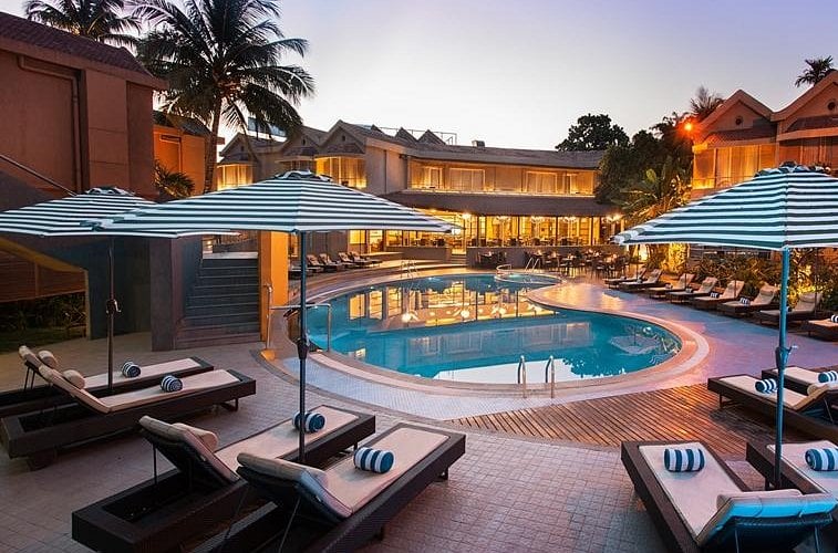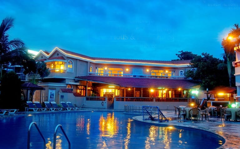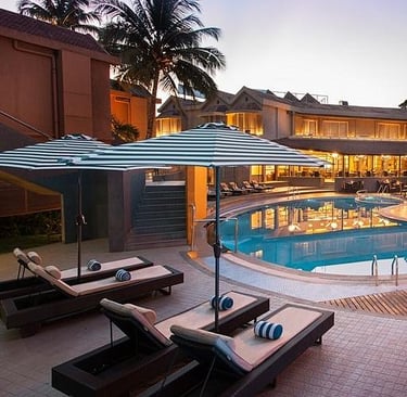 Whispering Palms Beach Resort, Goa is a 4-star property located near Candolim Beach. The resort features 106 Mediterranean-style villas surrounded by landscaped gardens. Accommodations include Balcony Rooms, Villa Premium Rooms, and Studio Suites, all equipped with modern amenities like air conditioning, minibars, and free Wi-Fi. Guests can enjoy dining at the multi-cuisine restaurant, Breeze, and relax by the poolside. The resort also offers spa services, a gym, and live evening entertainment.